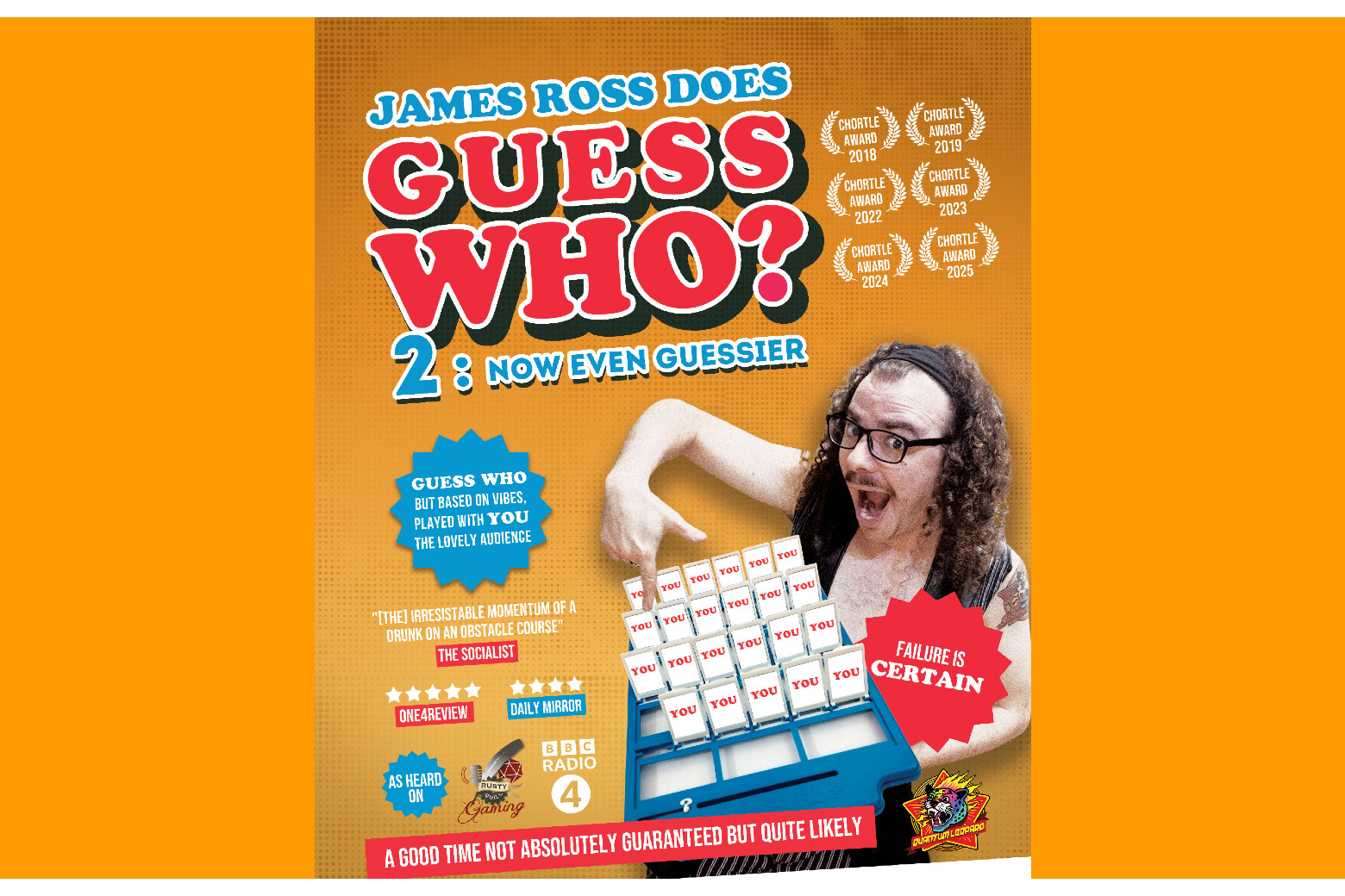 Remember the childhood game Guess Who? Come along for that, but based on vibes, and played with YOU the lovely audience! Comedian James Ross brings this very silly party show back to Hastings by popular demand.